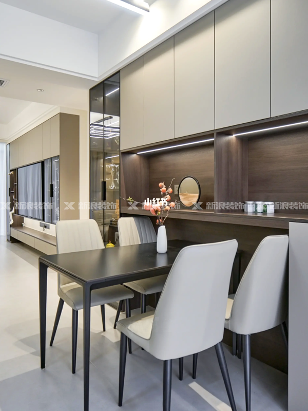 餐邊柜下方預(yù)留好尺寸,做嵌入餐桌