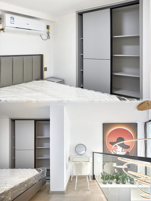 定制:柜體18厚杉木芯板;柜門PET膚感歐松板。包含百隆五金+掛衣桿+抽屜等。