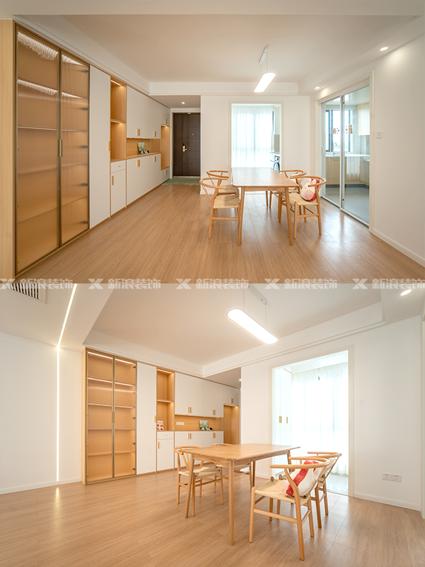 2.原木+白色全屋定制搭配長(zhǎng)虹玻璃柜門做點(diǎn)綴,更靈動(dòng)和美觀