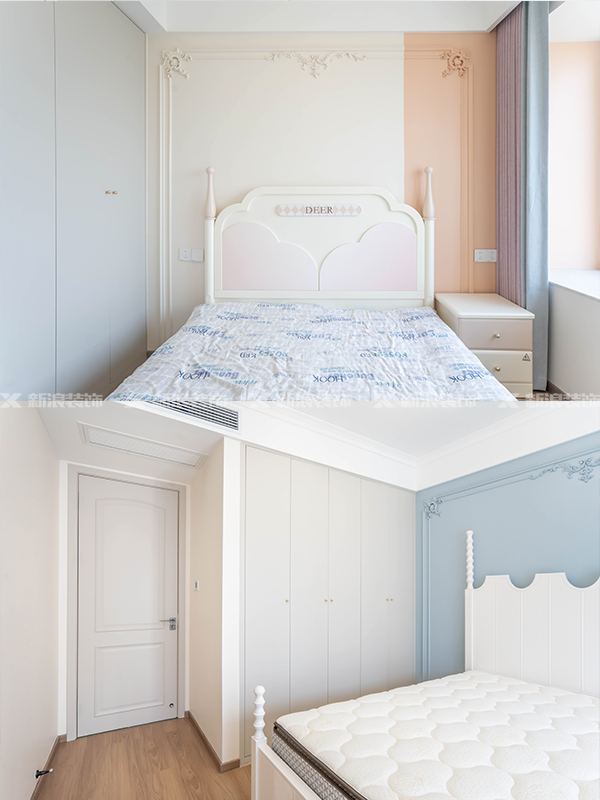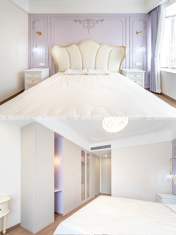 臥室用淺色系的背景墻做搭配,搭配造型柜,更顯優雅