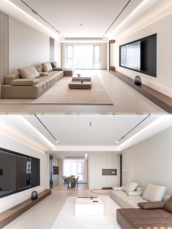 全房精選和定制柜同色家具,圍繞軟裝色系打造客廳視覺(jué)中心。