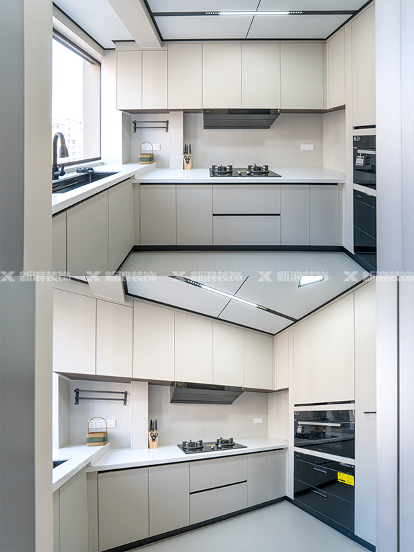 高低臺(tái)面、高端定制平板櫥柜,嵌入式蒸烤箱,方便快樂(lè)下廚房。