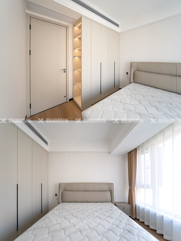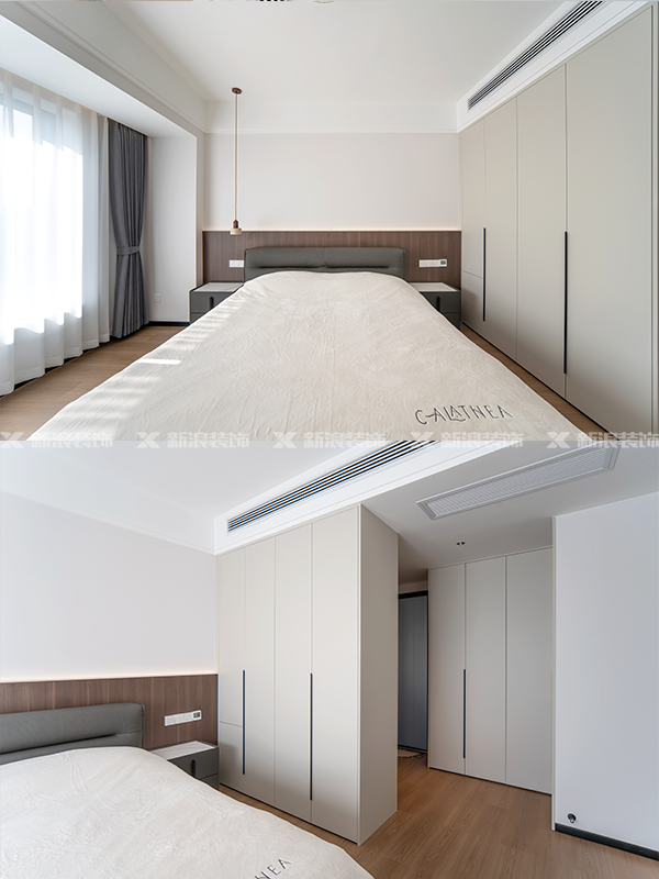 臥室定制衣柜,避免主衛(wèi)正對(duì)床頭的尷尬,一門到頂簡(jiǎn)約造型,主打一個(gè)實(shí)用。