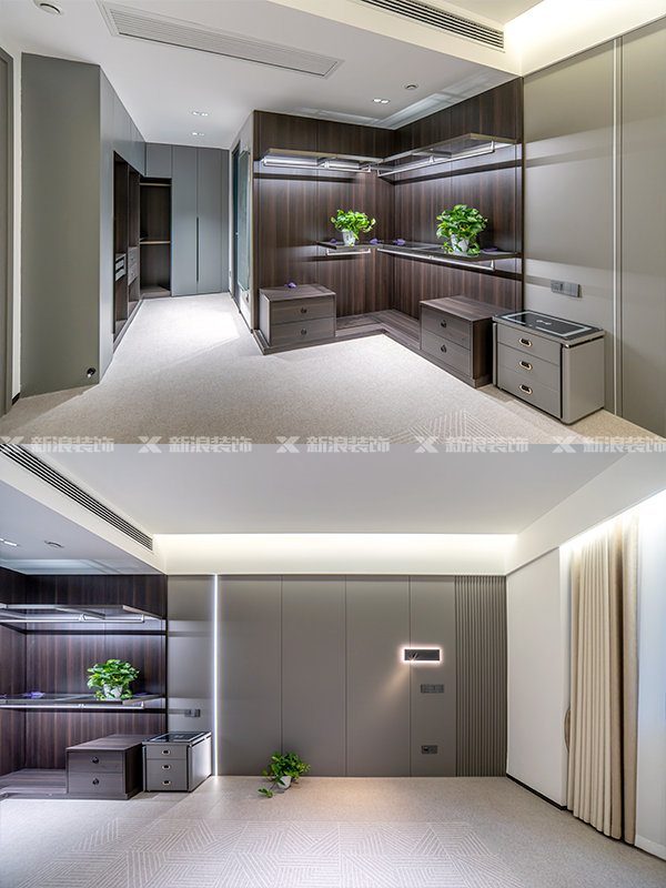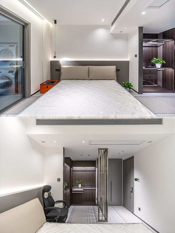 主臥做高級套間設計,木質開放衣帽柜結合鋼架結構開放式,更有一種打破傳統格式的效果