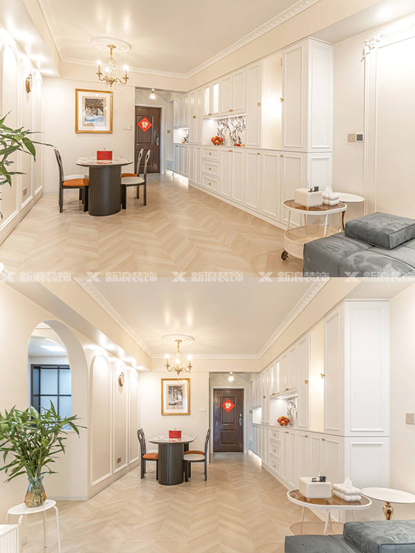 入戶過(guò)道和陽(yáng)臺(tái)吊頂做弧形設(shè)計(jì),搭配復(fù)古法式吊燈,打造溫馨浪漫的氛圍