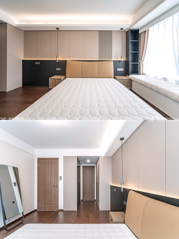 電視墻和主臥背景墻拒絕冷硬的石材,用淺色木飾面搭配黑色定制柜和暖色燈帶,在現(xiàn)代黑白風(fēng)格里也留有溫馨。