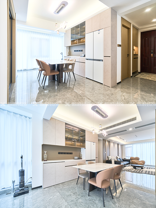 全房采用淺色系,餐邊柜后面墻體做改造,采用零嵌入式,讓整個冰箱柜和餐邊柜保持在同一平面,使得整體感增強
