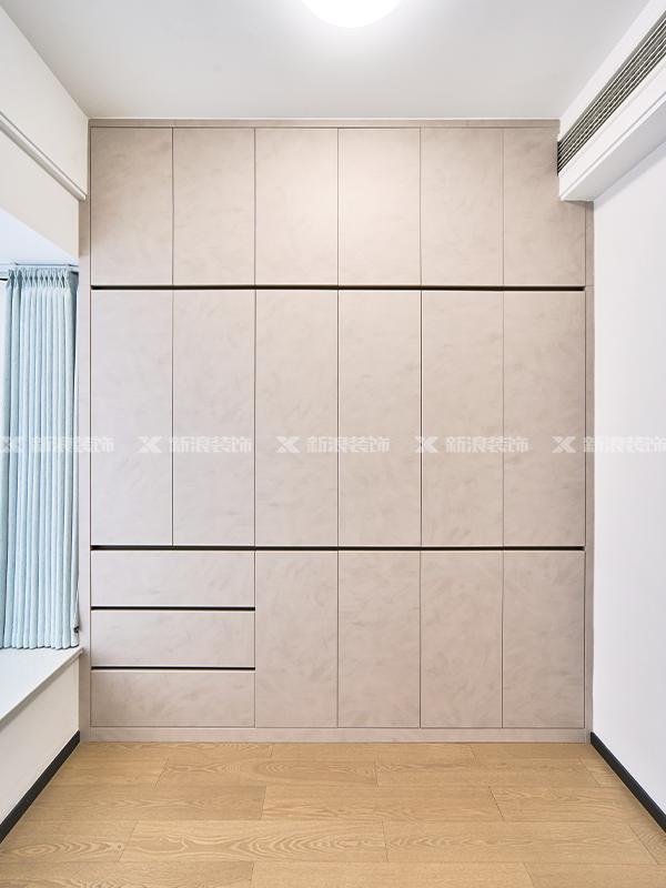 書房采用分段式無拉手設計,書房面積偏小,無拉手保證空間簡潔化。臥室采用一門到頂設計,主臥采用柜體色做柜門,一門到頂和分段式相結合,增加實用性。