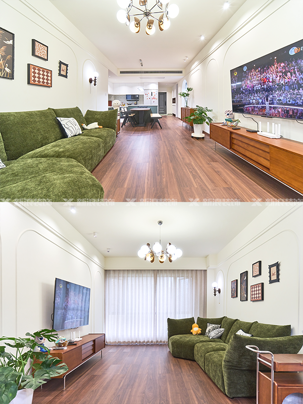 客廳墨綠色復(fù)古花瓣形沙發(fā),和餐廚區(qū)的綠色形成呼應(yīng),搭配移動小邊幾,復(fù)古背景掛畫、綠植,周末窩在沙發(fā)看看電影,獨(dú)居天堂get!