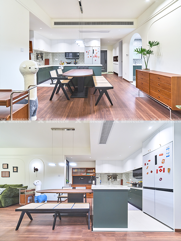 定制餐島臺靠近廚房區(qū)域作為操作臺的一個補(bǔ)充,使用方便。居中形成洄游動線,靠墻成品實(shí)木餐邊柜,收納超強(qiáng)。日常調(diào)點(diǎn)小酒、飲料,約三五好友淺酌,真的很愜意。