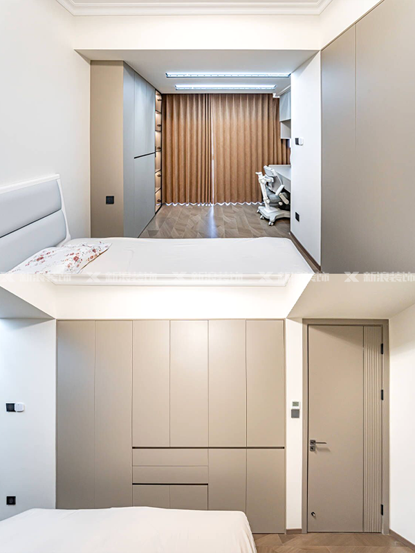 高端全屋定制:柜體板材為十環(huán)認(rèn)證的萬(wàn)象天冠18mm厚杉木芯板、歐松板膚感柜門(mén)、五金標(biāo)配奧地利進(jìn)口百隆一字鉸鏈、圓弧工藝、標(biāo)配18mm背板+通體型材拉手。