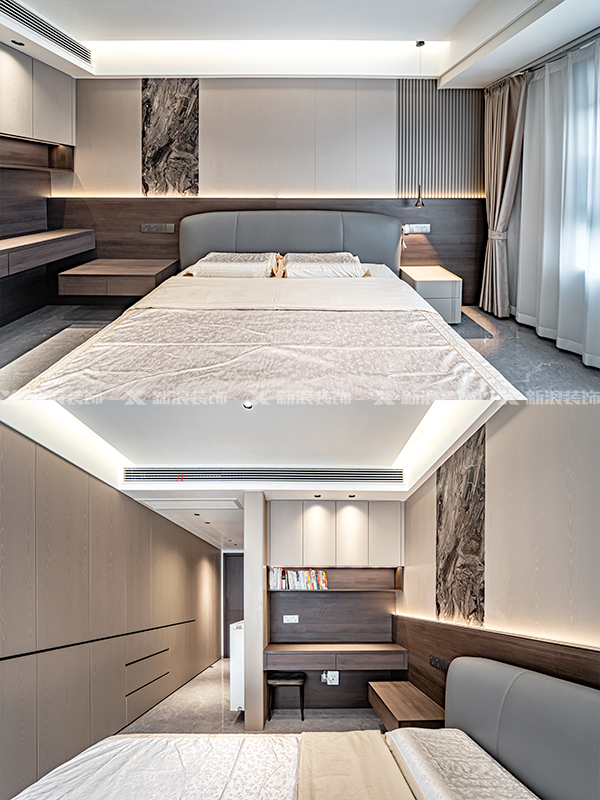 全房定制柜榆木色+淺灰搭配,充分利用空間做收納、書桌和梳妝臺、床頭柜,盡顯高定品質。