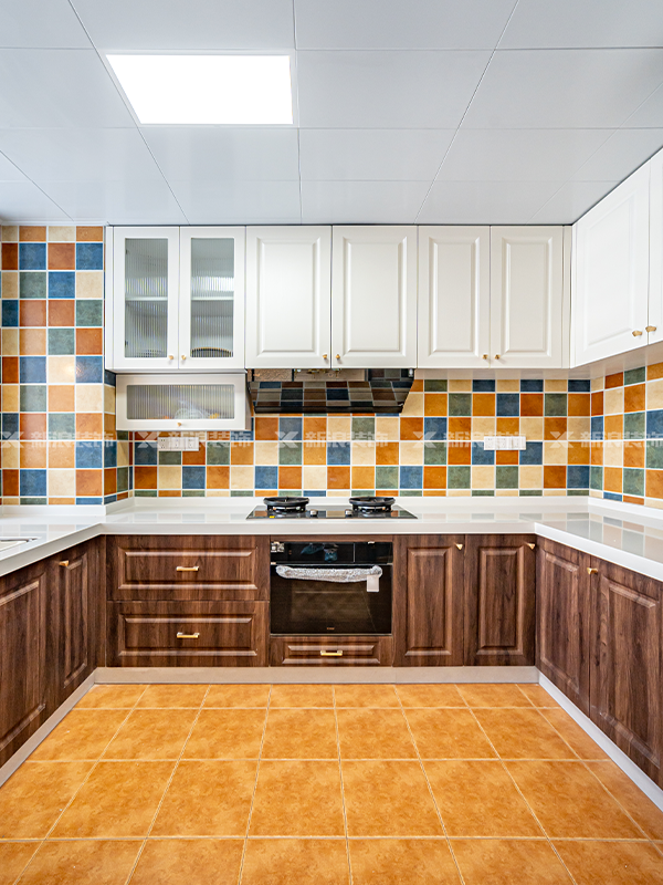 櫥柜吊柜和地柜采用同造型不同顏色搭配,地柜深色耐臟好打理,吊柜白色不壓抑。整體和墻面花磚相呼應。