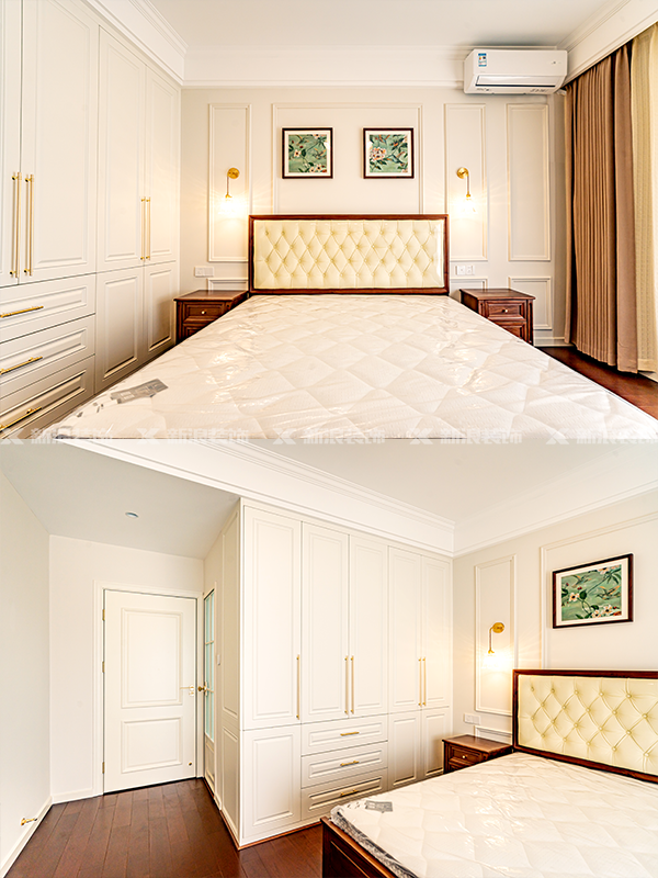 客戶家硬裝主要是法式復古風格,深木色地板全房通鋪,家具也是選的同色系,石膏線墻面造型+復古吊燈、掛畫點綴,處處都是濃郁復古風情。