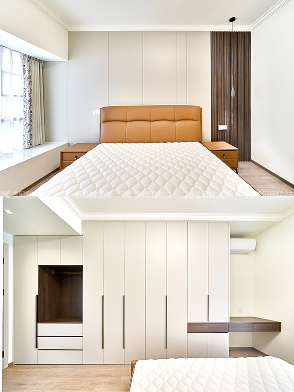 靠窗邊穿插設計一字長條懸浮梳妝臺,上方給空調留出空間,保持呼吸感