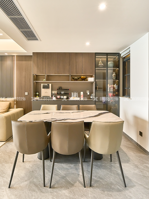 深棕色木飾面和灰色護墻板,展現沉穩優雅的格調,肌理溫潤自然。