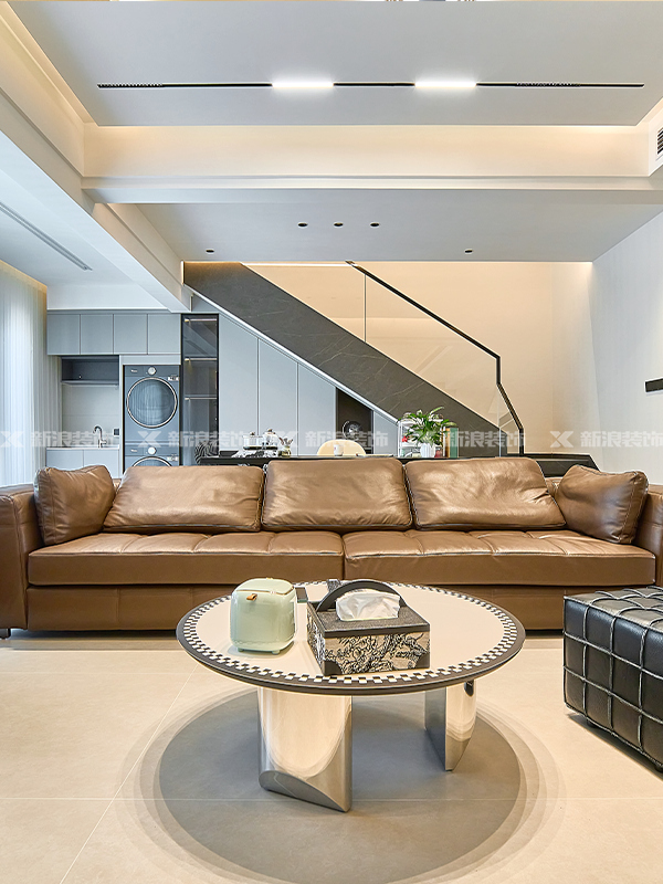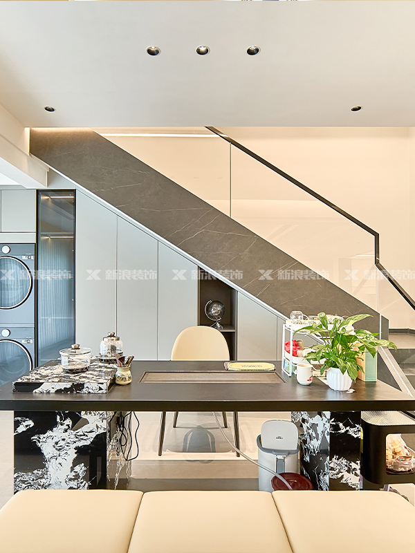 客餐廳空間一體,巖板茶桌的布置,為空間增添一份高級品味和獨特魅力