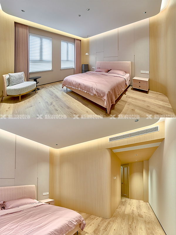 臥室軟裝木皮等材質上墻,呈現出豐富的層次感。