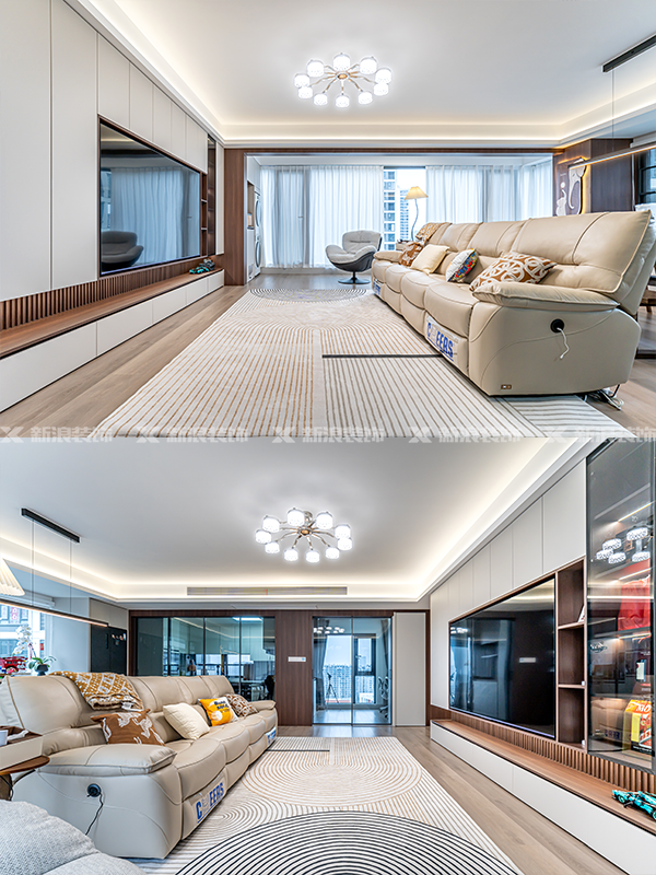 長沙裝修,滿墻電視柜與隱形門設計,新浪裝飾,電視背景墻,常德裝修,滿墻電視機柜,背景墻設計,大橫廳設計,裝修風格,木色定制