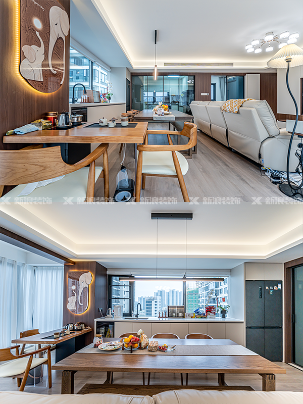 榆木色和象牙灰色搭配,沉穩大氣,搭配同色茶桌、邊柜,色調一致,視覺上舒適愜意。