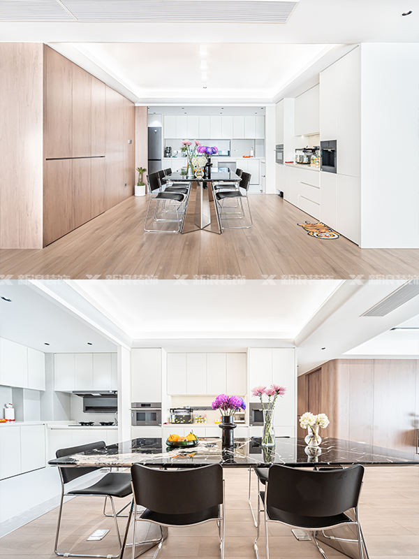 廚房改成了可開可閉的靈活設計,四聯動玻璃推拉門,空間整體更通透。