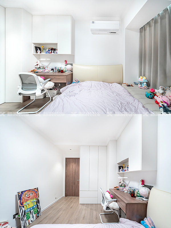 全屋定制柜用金絲橡木+珍珠白搭配,同樣做無拉手分段設計,抽屜外置,方便拿取。