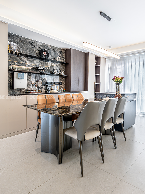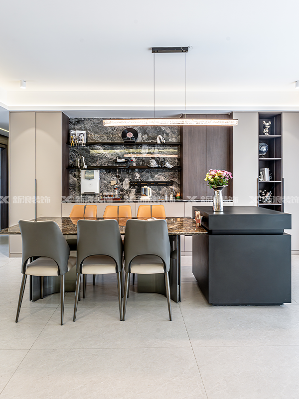 新浪裝飾,麗爾曼頓,極刻美家,餐桌導臺一體化設計,餐邊柜設計,巖板餐桌,家具好物分享,長沙全屋定制工廠,長沙靠譜裝修公司,高級感裝修,整墻餐邊柜