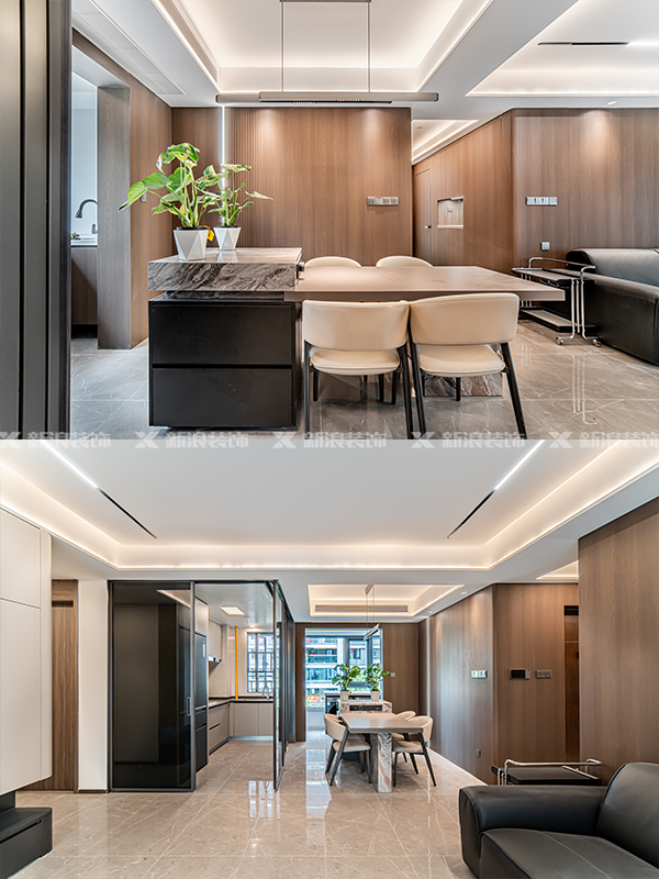 客餐廳咖色木色墻板,搭配大理石島臺,黑色大黑牛沙發,把整體的基調定住