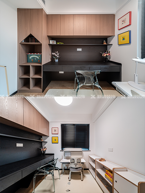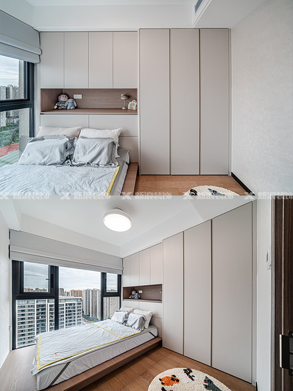 兒童房打破傳統設計,地臺床讓活動空間更集中,免拉手衣柜也能很好避免磕碰。