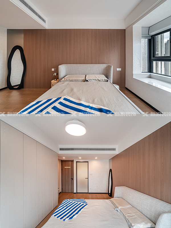 臥和沙發背景均為平板統一橡木色,搭配銀色拉絲做點綴,未做格柵等造型,簡約有格調。