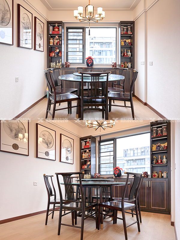 全屋門墻柜一體化定制,采用新中式流行黑胡桃色系,讓新中式更有那味兒了!